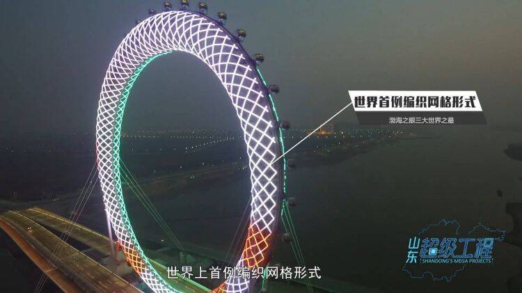 在经过了反复缜密的测试和复杂的收尾工作后,2018年5月,历时四年,这个由我国自主创造的,世界上首例编织网格形式、首例无轴式轮桥合一,世界上最大的无轴式摩天轮“渤海之眼”正式向游客开放。